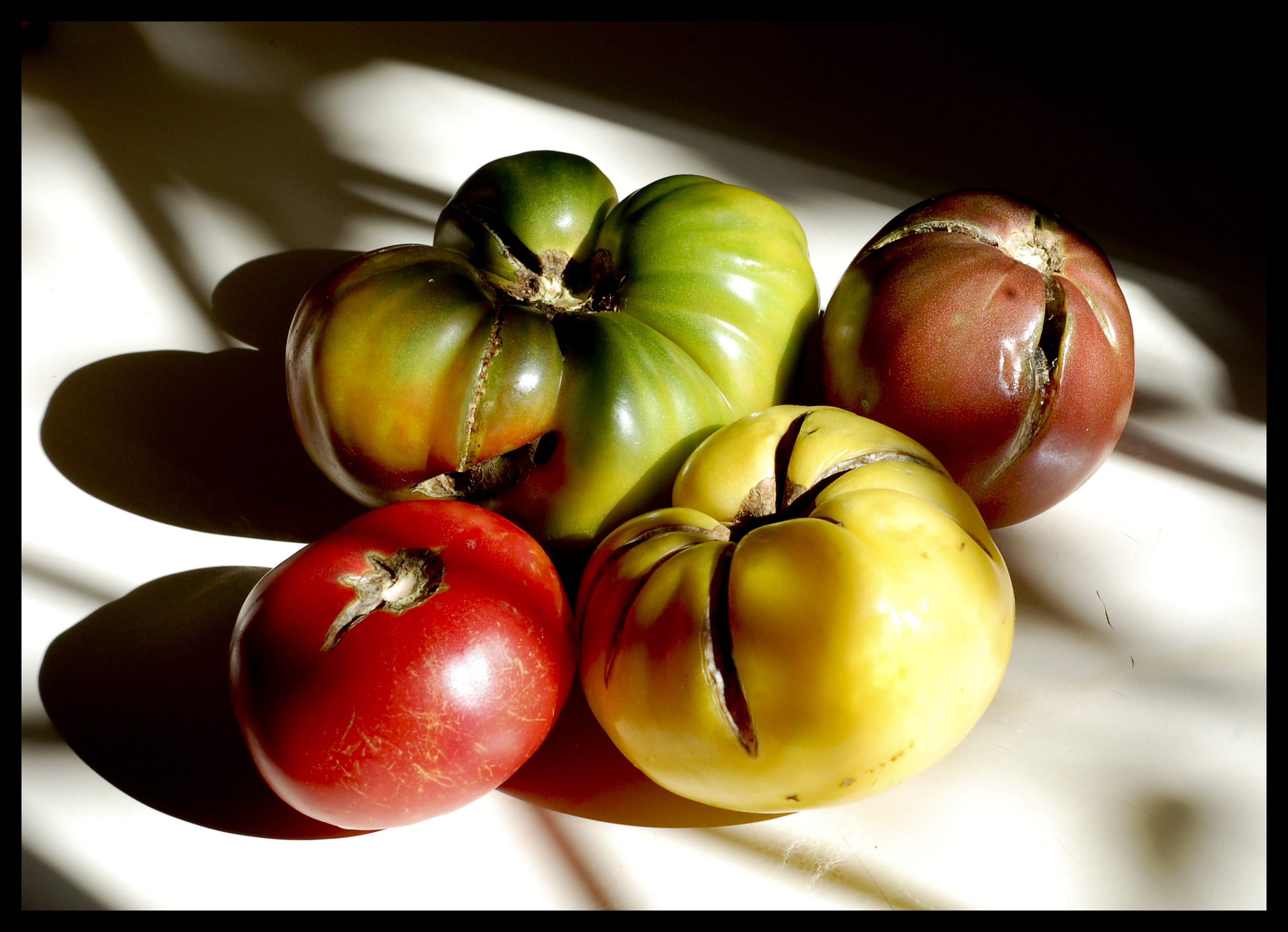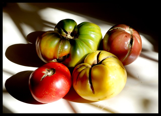 If you can still acquire heirloom tomatoes, run out and buy a couple and come back to make this amazing roasted garlic – tomato – cheese tart. On my last journey to the farmer’s market a couple weeks ago a grabbed a couple of those impossibly beautiful tomatoes and the result was delectable. The tomato man helped me pick out a blend of heirlooms to give me the perfect blend of sweet and tart. I kind of just love the endearing ugliness of heirloom tomatoes.