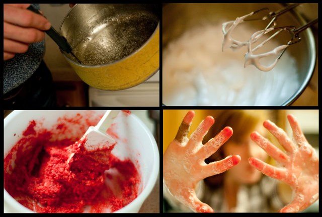 4. Add syrup to almost-meringue stuff and beat till meringue-ness is completed and cooled.