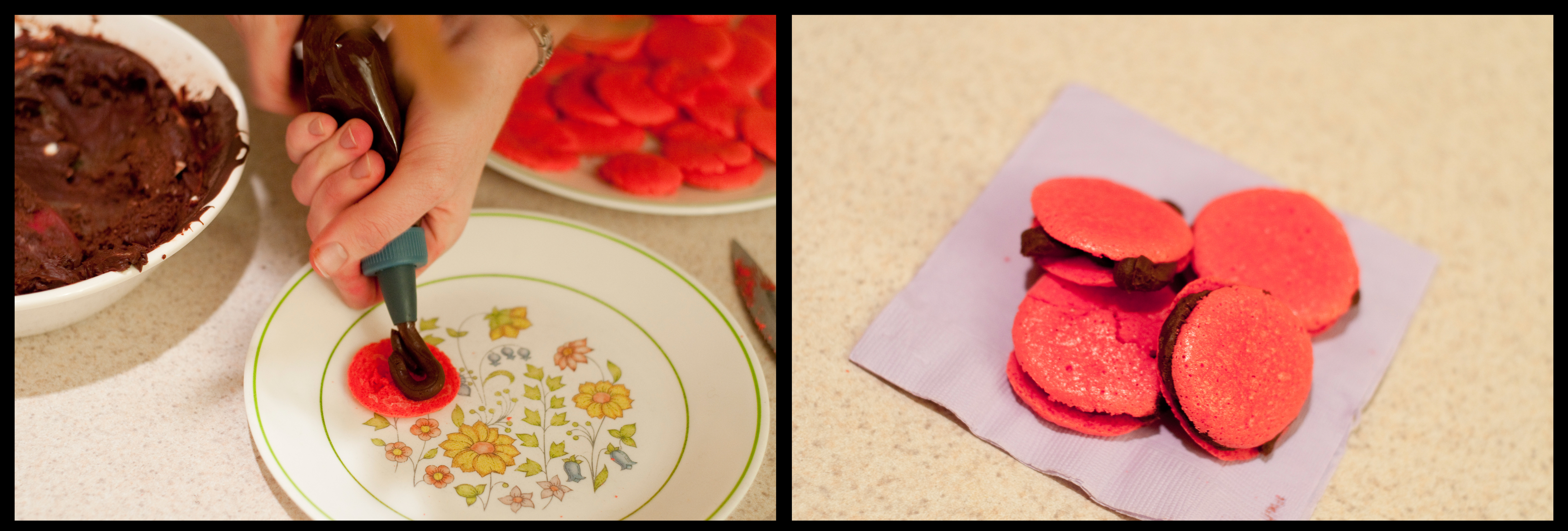 I decided on macarons aux framboises et chocolat (raspberry macarons with chocolate ganache) and started on the ganache. Ganache is heaven. Go make some now and be happy, as one can be nothing but deliriously content when mixing dark chocolate, heavy cream, and butter.Next we tackled the simultaneous processes of whipping eggs, simmering syrup, and making the almond paste/ raspberry mixture.  We might be the last people on world to own a Kitchenaid mixer, which would have greatly expedited this process that instead involved all 6 team stone hands working together to avoid scorching the syrup or over whipping the eggs.  This endeavor was briefly interrupted when I spilled red food coloring, dying the counter crimson. Cue bleach, red hands, and lots of soap.  Counter returned to normalcy though hands remain red.Next came the “macaronnage” or the actual combining of the meringue and the almond mixture. And finally, the puffing out of the perfect macaron rounds. This took all three Stone children with Zach replenishing the pastry bag and catching drips, me squeezing diligently each round, and Lyman standing by with paper towels to do damage control.  Lyman has enacted this role most of our lives, come to think of it. He’s pretty good at cleaning up after his older siblings’ messes.