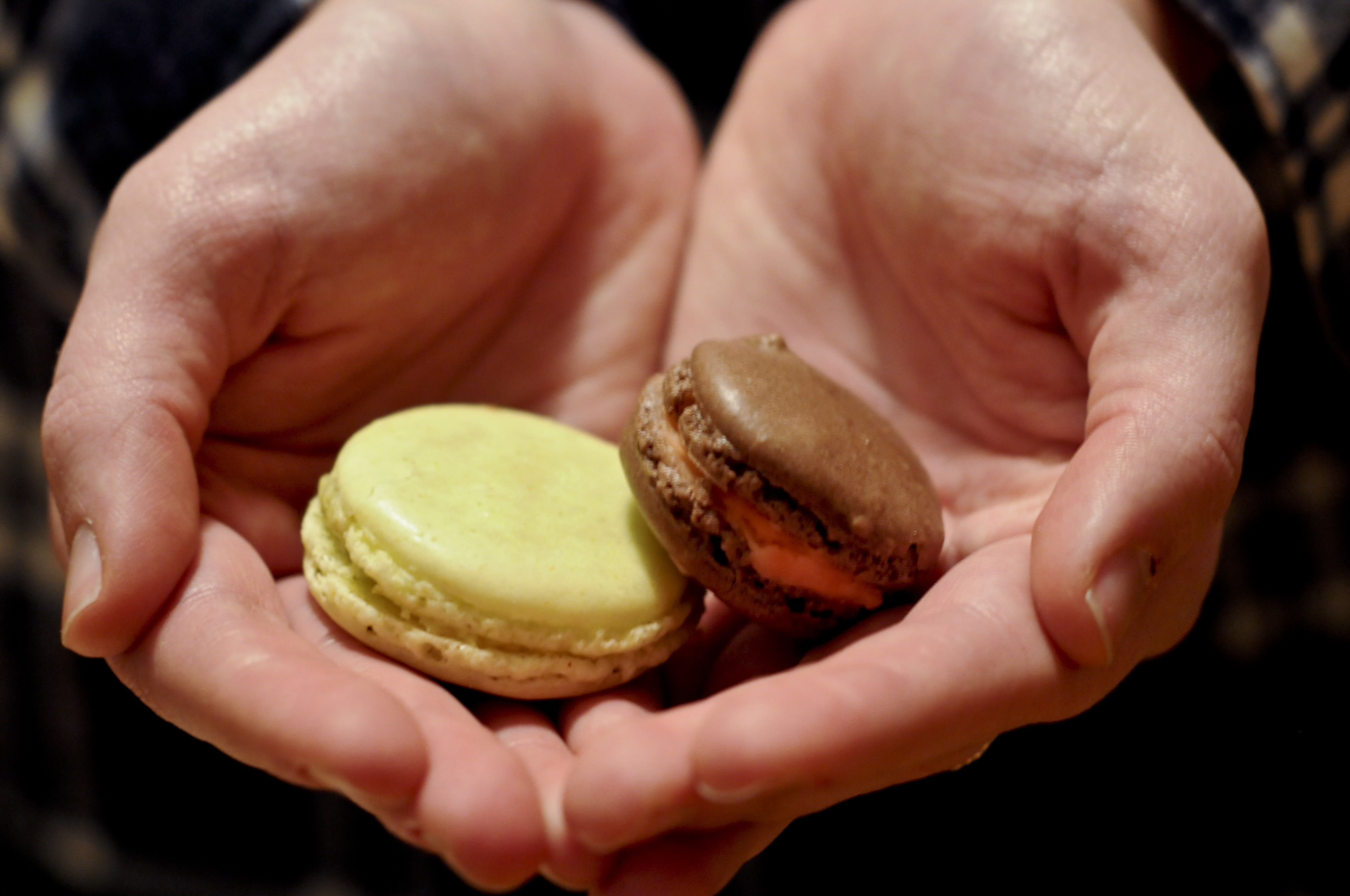 I have been remiss in posting and in thanks, so here is a long overdue blog to Joy Schultz who was inspired to go out an make some macarons and then send them to me for some feedback.  She, however, did not commit the fateful wax paper mistake that effectively destroyed my macarons, and so hers were perfect. I think they are by far the best ones I have had since leaving France.  She followed this recipe, used my chocolate ganache recipe for some, and then improvised a delicious orange butter-cream filling for some others.  These pictures don’t give justice to how beautiful they were, and the raspberry ones aren’t even shown because I devoured them before I could even think to snap a picture.   Thanks Joy!