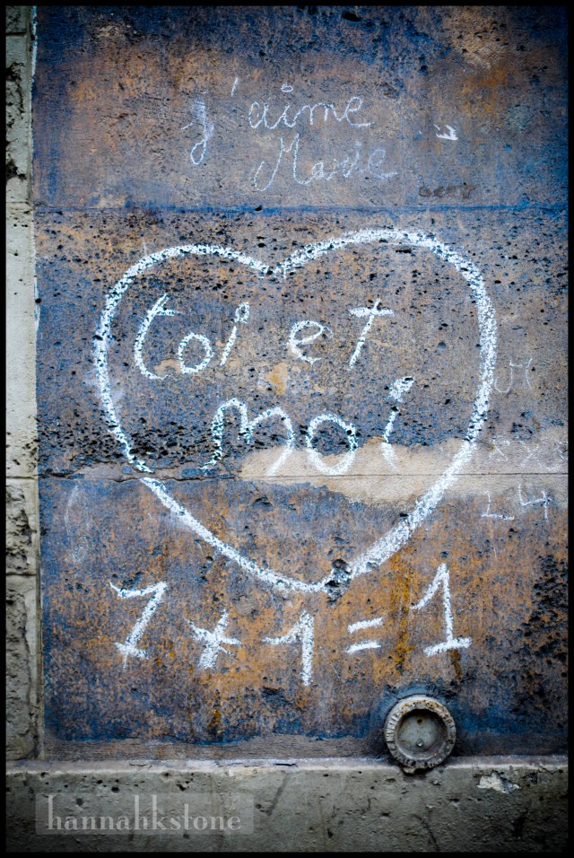 I can’t decide what it is that makes the city romantic, or if it just seems more romantic than it is because social norms and anonymity encourage public displays of affection. Of course, there would be no shortage of legitimate qualities to make it legitimately romantic.  There are the musicians on every corner playing love ballads, the pestering rose sellers who render the need for foresight obsolete, the sweeping vistas that transform a simple walk into a perfect date, or the crowded restaurants meant for parties of two.  Because I am not with the one I love, I am tempted to be cynical about the suffocating sweetness of the atmosphere. But at heart, I can’t find any cynicism because I am a true romantic. I love love and it is everywhere. The other day I was walking back to a friend’s apartment and I saw this painted on a wall. It is math that I can understand.