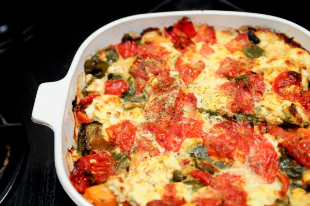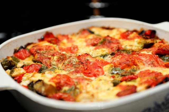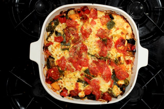 Ever on the quest for good lunches, and recently on the quest for less bready/pasta-y options, this roasted vegetable frittata has become a favorite. It is basically like a baked, goat-cheesy version of ratatouille, and if anything has a baked goat-cheesy version, I feel that it is always a good option. This recipe is from Bon Appétit, but it has been very adapted. Adapted, because some of us do not have spacious kitchens, double ovens, infinite cookie sheets, fresh thyme on hand, dishwashers, or the time to wash a millions separate bowls and roast and then peel the peppers and tomatoes. It has also been adapted to transform it from a quiche to a frittata, and to remove the fennel, because it weirds me out to eat fennel too much as it is a vegetable that tastes like licorice.