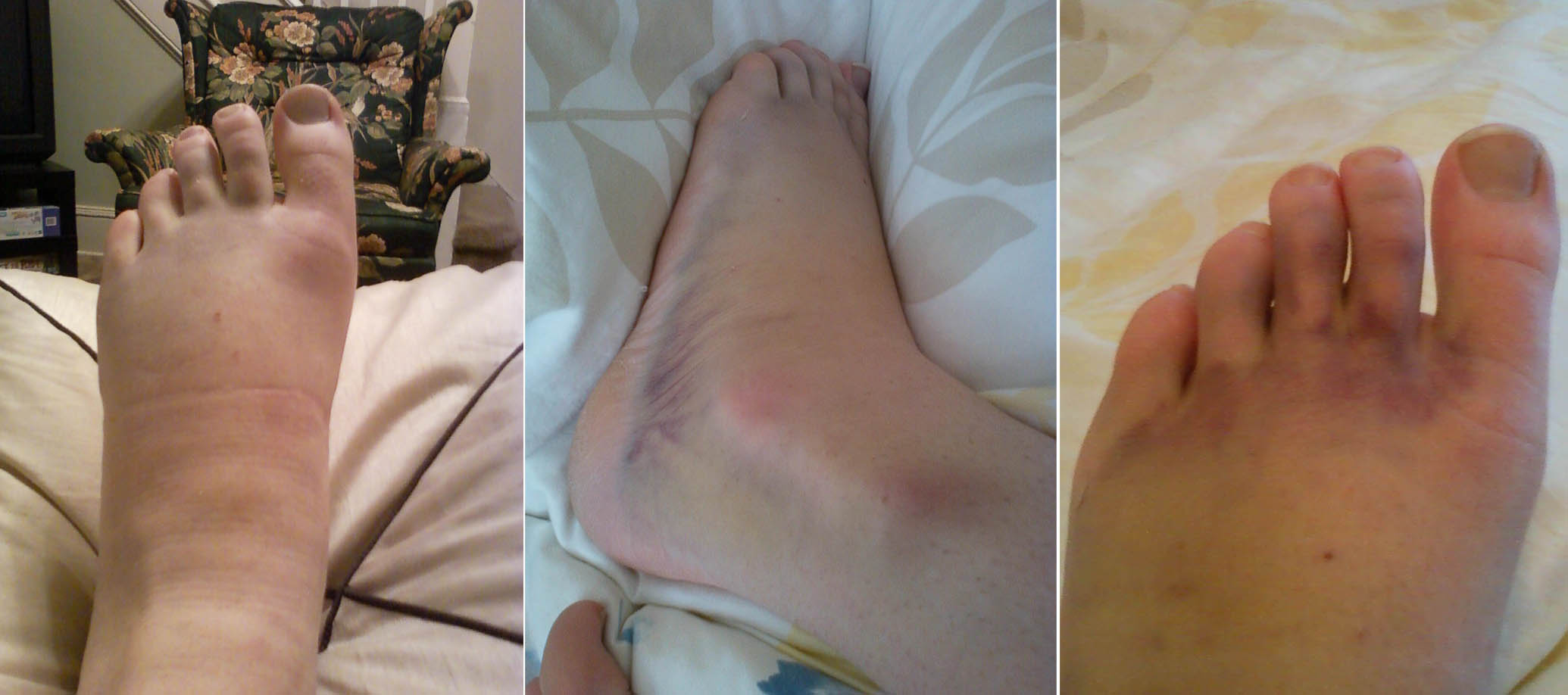 This time, it ended with my foot looking like part of Glimmer’s body after she was attacked by Tracker Jackers (thanks to Bethany, for the comparison). Here is a progression, because I am sure you are dying to see it. (Actually, I think higher of anyone reading this than to actually think that. I just want some more sympathy, as it is healed enough now that people no longer pity me.)