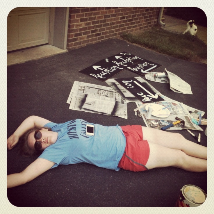 This summer is also endless discussions over flowers and ties and whether people care if their invitation says Miss or Ms. This summer is laughing with my mom over plans and then fighting over whether the directions should say “Turn Left” or “Go South.” This summer is painting signs and tying ribbons and staining wood. This summer is writing cards and sticking stamps and shopping for favor bags. This summer is fittings and hair trial runs and planning and hoping. This summer is long discussions about the wedding when really we just want to sit on the floor and hug and cry because it won’t ever be like this again.