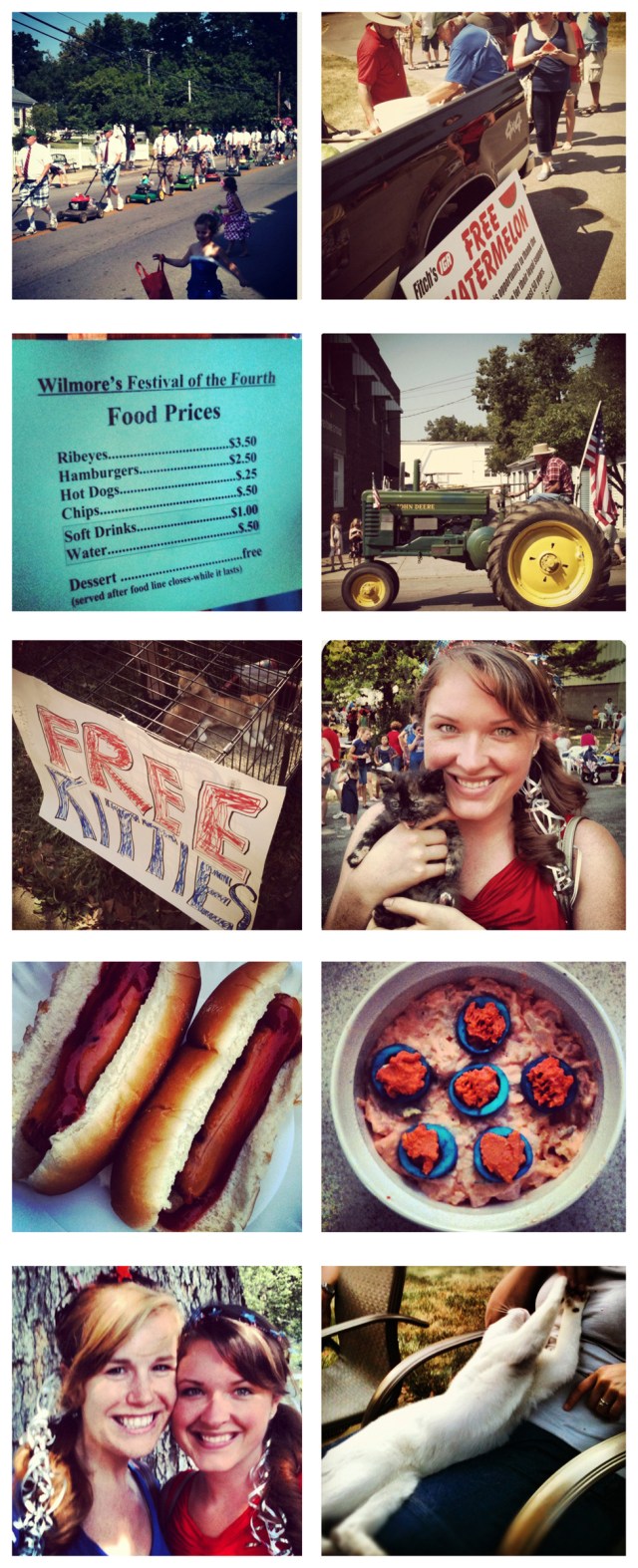 the synchronized lawnmower brigade rolls through town. the local grocers chop watermelon for hours in the sun. a menu fit for paradise. man on tractor, smoking a pipe, with a flag, in a parade – that is America. free kittens. 25 cent hotdogs. patriotic potato salad. sparkly crowns from the craft fair. Ivy, the adopted stray and cookout companion.