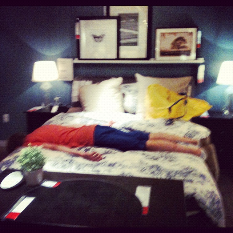 I had lots of lofty ambitions for this week, one of which was a nice long post with tales from Banff…. but that didn’t happen. Instead, this week has been lots of Craigslist searching, returns, and cleaning, culminating in a trip to Ikea, that left us both wiped out. Note to self: Ikea on a Saturday afternoon is a special form of torture, especially when you get trapped behind a Slow Walker, and it seemed like there were only Slow Walkers at Ikea today. Also, children should be banned from Ikea. And they should have adults only shopping evenings with soft jazz, appetizers, and empty aisles. As can be seen below, Ikea almost got the best of James, and this picture was even taken before we got to the “Marketplace” and found that Ikea was fresh out of Klôpsloffstëinerfloofds and Aaaauuuunnnderlandershandgermidsts. Or whatever they are called.