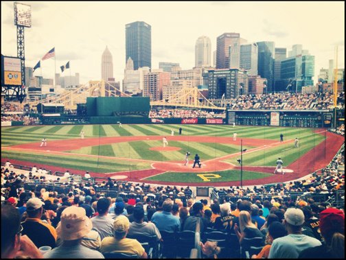 I know it is weird, but PNC Park is one of the prettiest places ever. Pittsburgh is a kind of grungy town, but there is something honest about it, hardworking and aggressively beautiful. It is a testament to American pull-yourself-up-by-the bootstraps spirit, with its skyline a interesting blend of modern marvels and gothic inspiration. It is past glory trying to forge ahead in the present. And seated in the stands cheering for a team that might just be pulling it together, I though that maybe, just maybe, I could become a Sports Watching Person (not playing – there are limits). Because everyone becomes a family when they are watching a baseball game. We all high-five and cheer and talk like we know each other. And everyone becomes a patriot while watching a baseball game, as we take off our hats for the national anthem, and honor present soldiers, and cheer for the Cub Scouts who carry the flags. And everyone, it seems, becomes just a little better then they were before they started watching.
