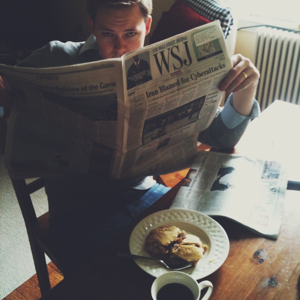 (Disclaimer: Yes, James is eating apple pie for breakfast in the photo above. Early months of marriage are high on love, low on nutritional value. Love and domestic bliss can be rough on healthy aspirations)