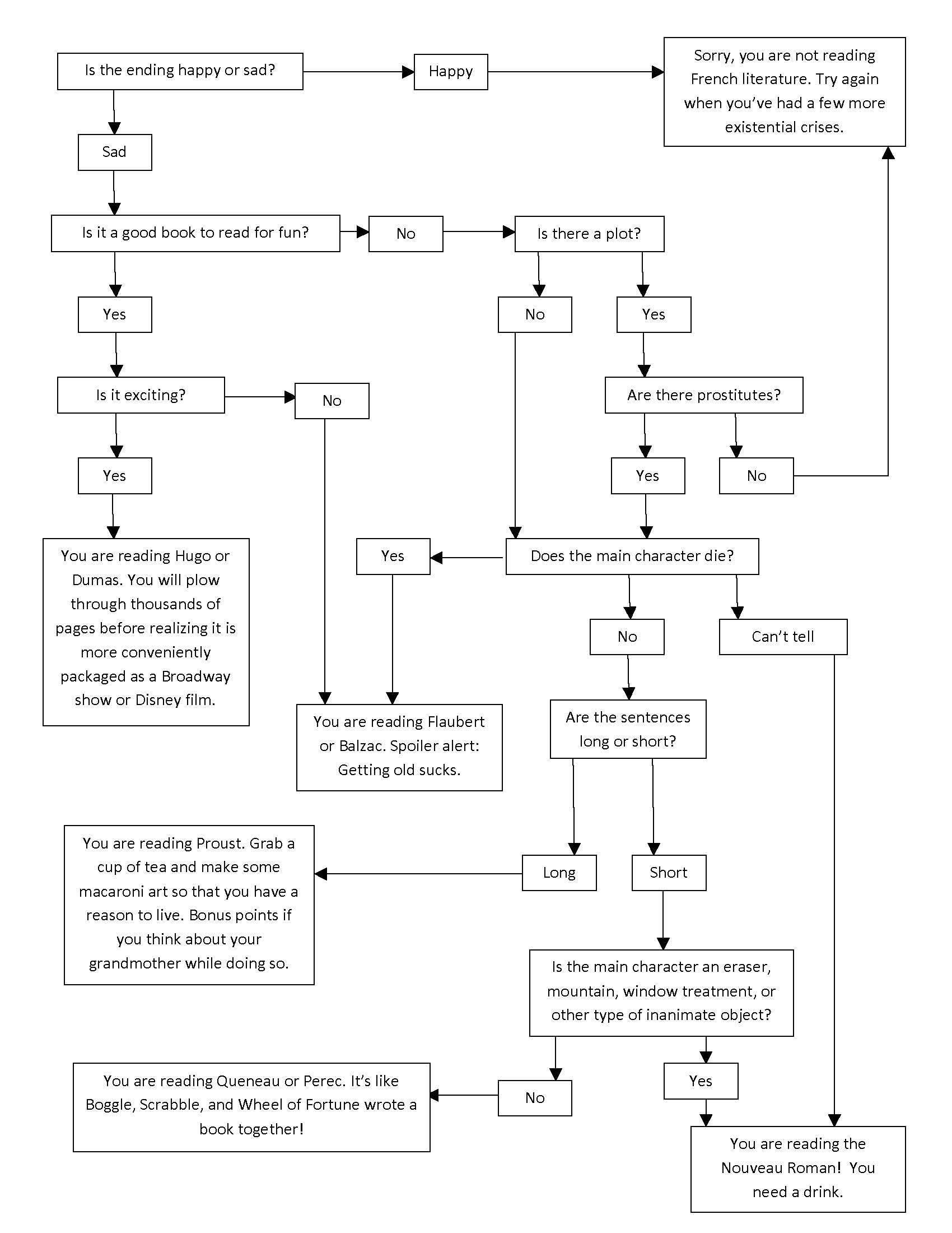 This afternoon at 1 I take my MA comprehensive exams, which means there has been a lot of studying lately. I have been reviewing all the books I’ve read over the past two years and tracing connections across genres and centuries so that I am ready to sit there and write all afternoon and into the evening. Preparation has been, in fact, surprisingly simple, as French books share a remarkably similar plot line. Since I am sure you are all dying to have the truth of all French literature revealed to you this morning, I give you the following flowchart, created by Kristen in her notes during class. French%20Literature%20Flowchart-2Any French literature fans out there? What are your favorites and how do they match up with this chart?