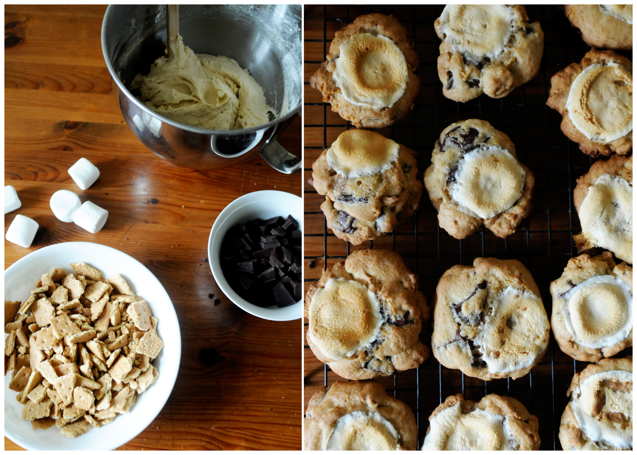 When we were in Banff for our honeymoon last year I found a recipe for s’mores cookies in a newspaper that I ripped out to try eventually. I finally got around to making it a couple weeks ago. I’ll be honest, it wasn’t as good as an actual s’more, but I’m not sure if you can improve on the original. (One exception: wouldn’t it be awesome to make s’mores with Petit Écolier cookies? This stroke of pure genius came to me when I was trying to make s’mores in a poorly lit area and kept dropping the chocolate off the graham. It’s a pretty great idea, I know. Let the record show that I thought of it first when it eventually goes viral and starts showing up on Pinboards everywhere.) But if you aren’t a huge fan of s’mores, then you might find these cookies an improvement. At least, that is how James felt. In any case, I will say that it is absolutely imperative that you eat these cookies warm or the mallow gets really tough. However, they do reheat pretty well.