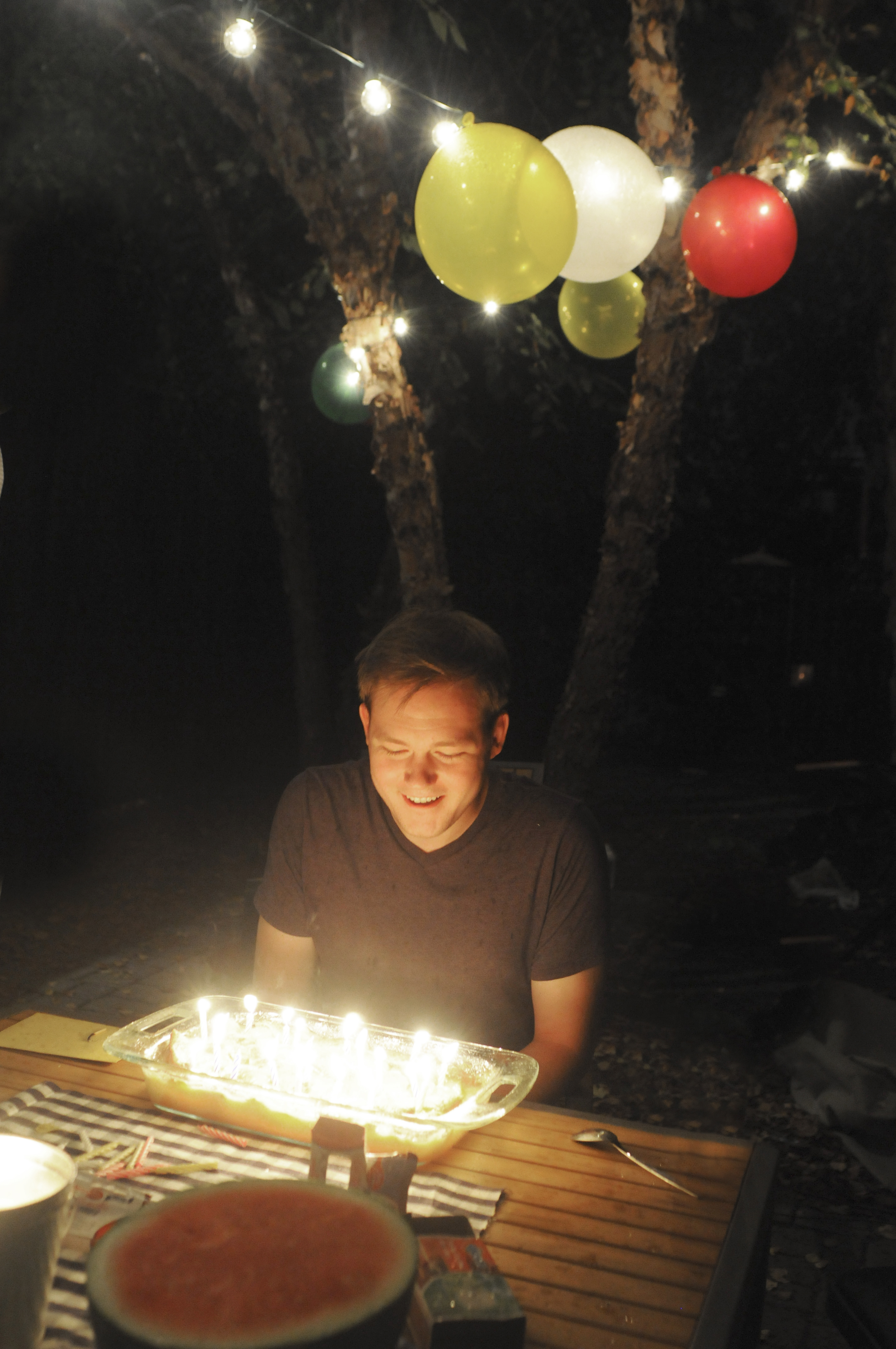 On Saturday night, we had a laid back birthday cookout at my brother’s place. I say laid back, because my extroverted self desperately wanted to invite everyone I had ever met and make an entire canopy of bunting while forcing everyone into party hats while they made birthday speeches about James. But I know my introverted husband, and he wanted burgers and a very short guest list. I did sneak some balloons though, because I cannot deny my true self. I also conceded to his desire for peach cobbler over cake. Now, you know how I feel about people who claim to hate cake, but I also believe in letting the birthday person call the shots, so gooey wonderful peach cobbler it was. It started raining right after we took this picture and we had to flee inside, but it was still a perfect evening of friends and food.