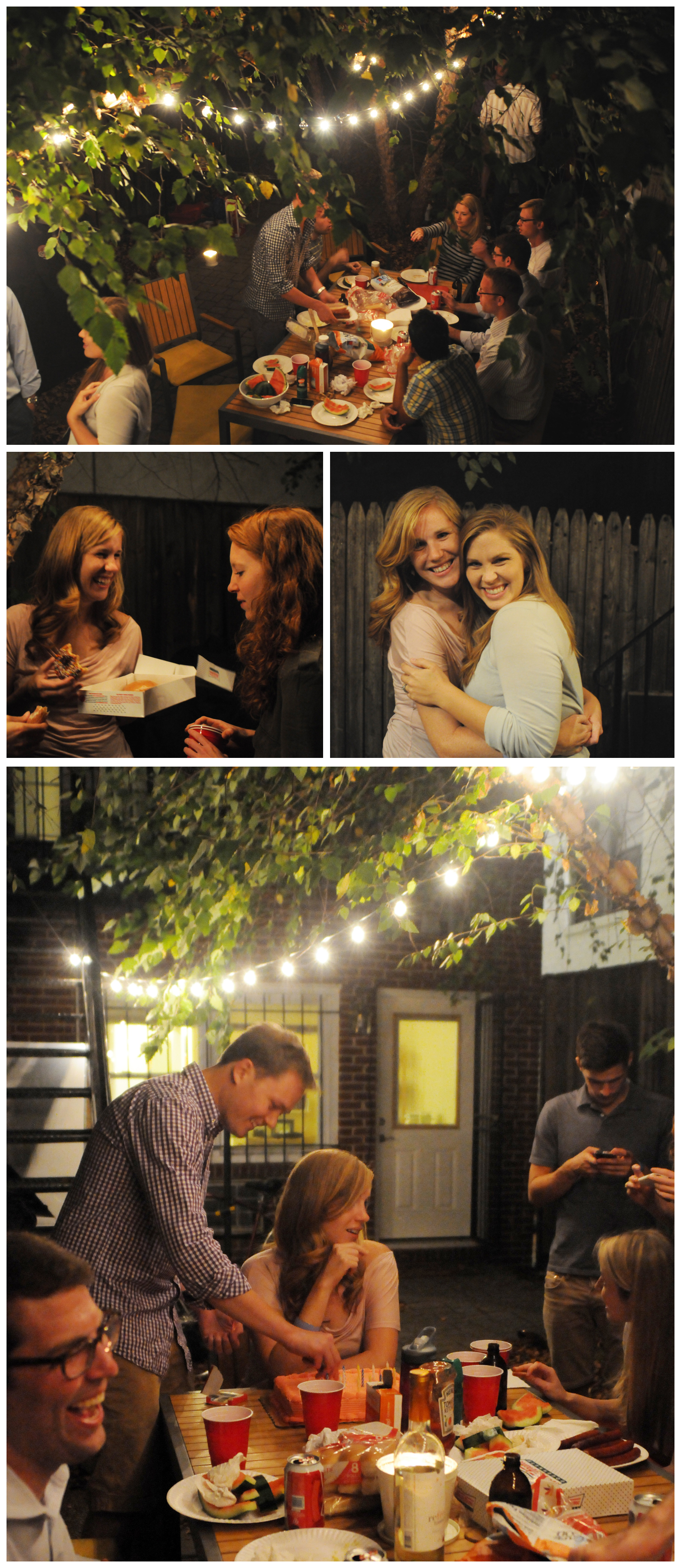 James, having taken note over the years of what I demand prefer in terms of birthday celebrations, organized a party with some of our favorite DC friends in Lyman’s backyard. (Dear Housemates of Lyman: I promise that when the cold weather comes, we will actually go back to celebrating at our own house, because I know that this, after the Fourth party, and James’ birthday, might be getting a little tedious. But if you don’t want us, you really should have taken down those globe lights, because they basically scream “COME HAVE A PARTY HERE!!!” and I am powerless to resist the call of some globe lights.) We had pink cake (my birthday staple), hotdogs, girly drinks, and some other yummy treats that are totally off-limits given the parameters of the recently began Hannah and James Health Initiative. But oh wait — there are no calories on birthdays. Winning.