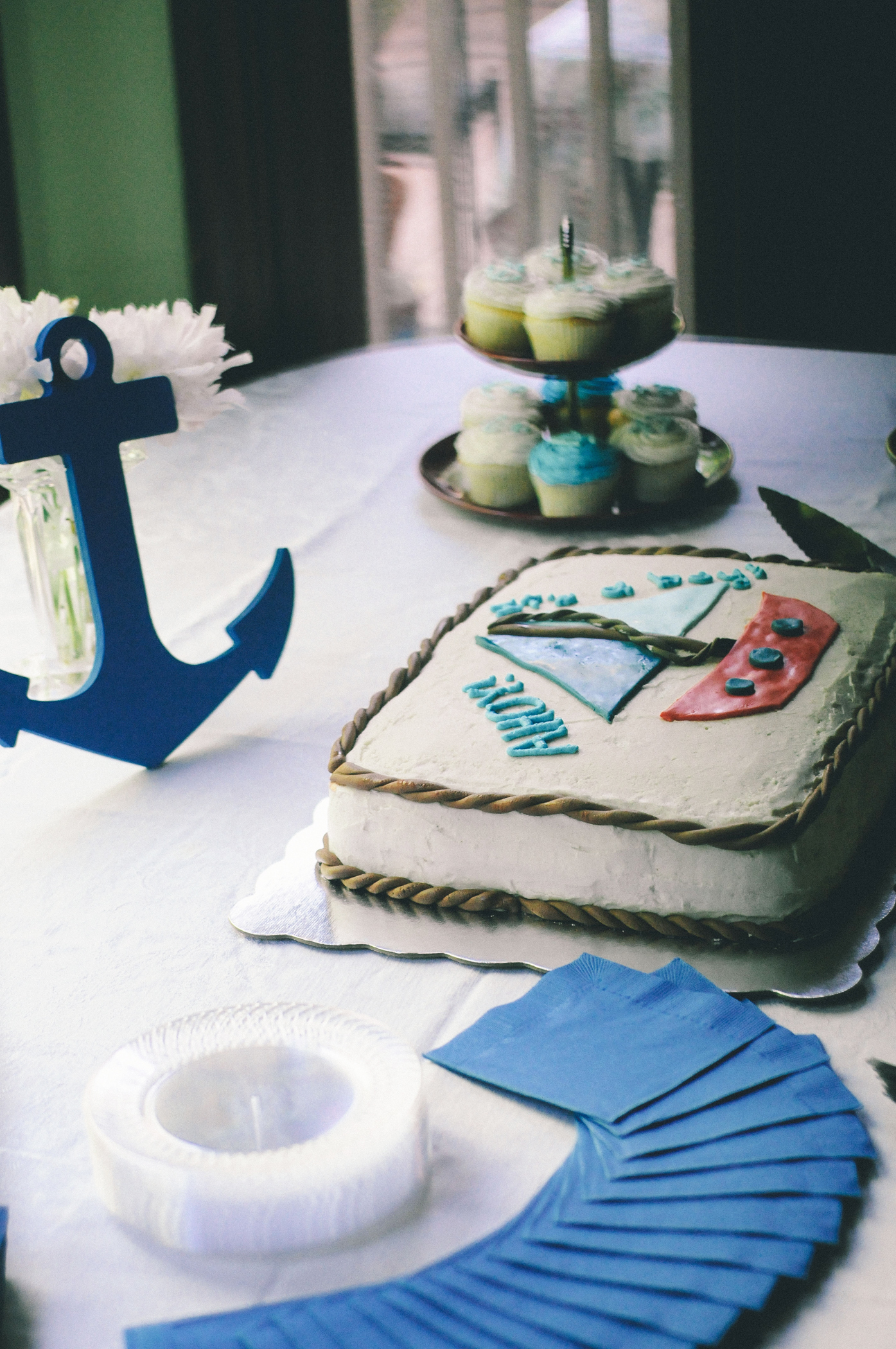Summer2014-1nauticalbabyshowerSummer2014-4nauticalbabyshower2Summer2014-10Summer2014-14Summer2014-15Summer2014-16This past weekend I interrupted my week of lounging in Kentucky to go to Cincinnati to help throw a baby shower for my sister-in-law. As soon as Laura told me she was having a baby I was all about THE SHOWER. True, showers, like all baby things, tend towards the feminine side, but that didn’t mean that I didn’t have some big ideas for my nephew. A Le Petit Prince themed shower with foxes on everything! A Peter Rabbit themed shower where we pretended that everything was masculine because Peter is a boy! And finally the winner, a nautical shower, mostly because I wanted invitations that announced “Ahoy! It’s a boy!” As you can see in those photos, the ladies in charge of food and decorations (I held down the invites and games) outdid themselves. That cake? It is double layered with lemon curd filling and that is marshmallow fondant so you can actually enjoy eating the pretty decoration. The anchors on those cupcakes? Those are handmade dyed white chocolate edible anchors. From the saltwater taffy favors, to the convicting scriptural charge delivered by one of the ladies, everything about this shower was perfect.