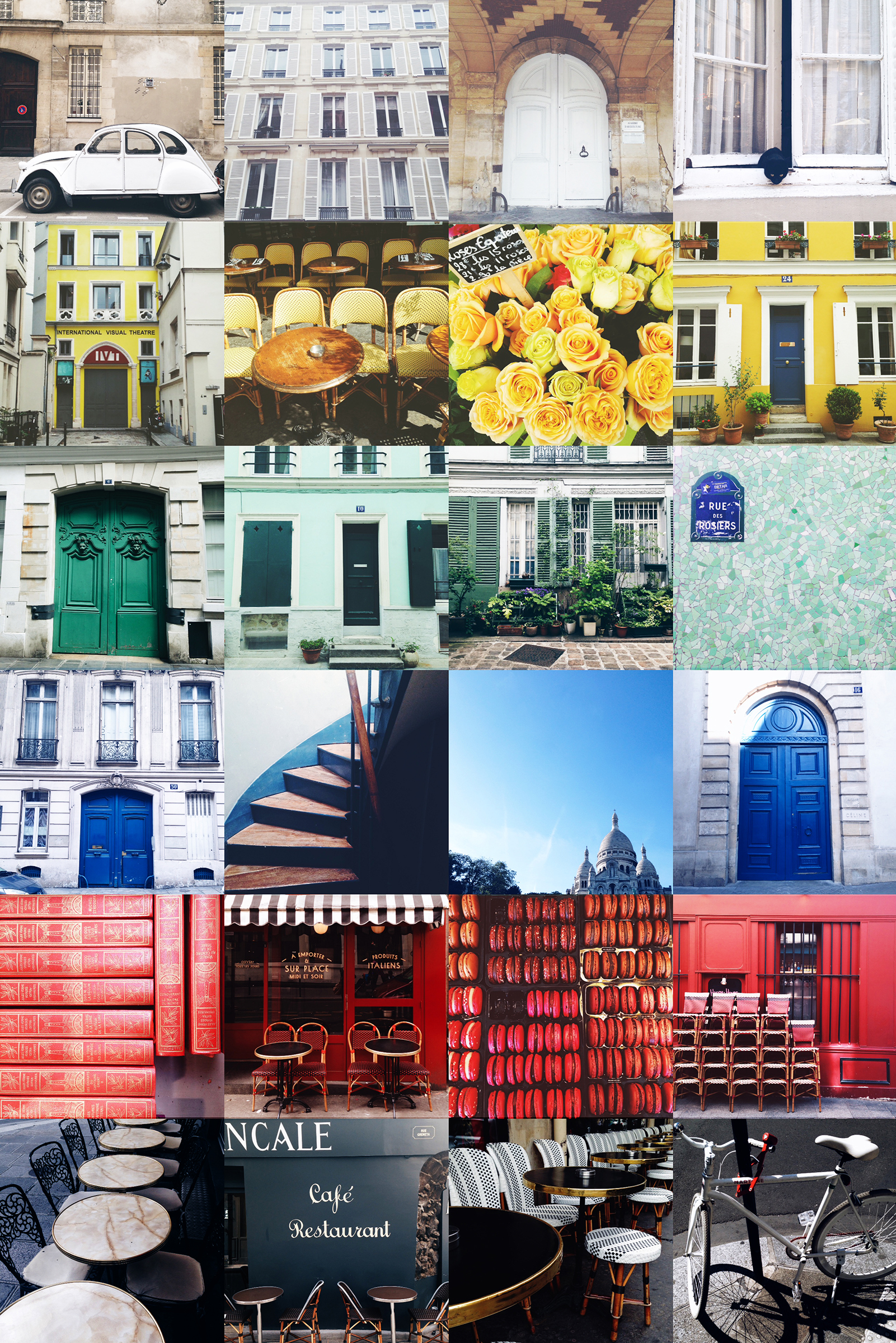 I dragged my big camera around with me the first day or two, but after a couple days I left it at home. Let’s be honest – I have a lot of pictures of Paris. I will whip it out again when my students role into town tomorrow, but I don’t really need tons more photos of this city. Instead, I found myself enjoying the ease of pulling out my phone to capture all the beautiful and colorful bits of this city. And one night, when I returned home after a day of wanderings, I was scrolling through my photos and it came to me…