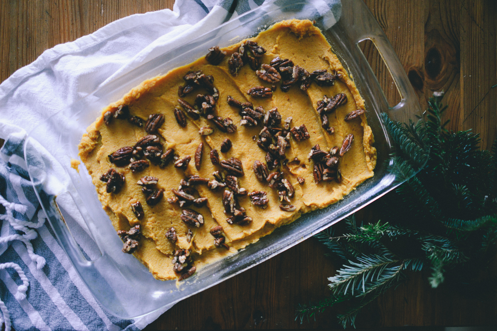 We had a Friendsgiving right before actual Thanksgiving, and a friend of mine made the tastiest sweet potato casserole. I love all sweet potato casseroles, but this one was extra good because it wasn’t too sweet. It was topped with crispy pecans and bacon instead of marshmallows, making it a much better savory side than the standard fare. When she passed on the recipe, I realized that I could make it compliant pretty easily, and voilà — something clean that still tastes just a little bit like all the decadence that is December.